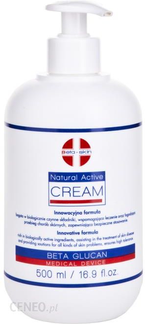 Beta-Skin Natural Active Cream to unikalna formuła zapewniająca bezpieczne stosowanie, niwelująca objawy towarzyszące poszczególnym dermatozom, tj. uporczywy świąd, uczucie pieczenia, zaczerwienienie oraz suchość skóry i nadmierne łuszczenie. Wyrób wykazuje intensywne właściwości regenerujące, łagodzące zmiany skórne, regulujące wzmożony łojotok i nadmierne rogowacenie.