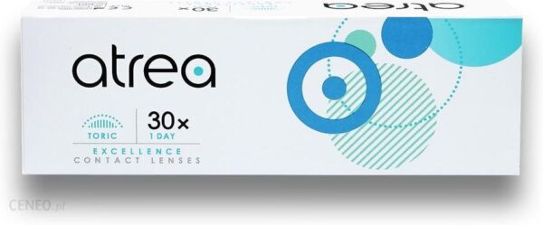 Toryczne soczewki jednodniowe Atrea Excellence to soczewki dla użytkowników żyjących wpośpiechu. Dzięki najnowocześniejszej technologii miękki ielastyczny materiał silikonowo-hydrożelowy zapewnia wysoką przepuszczalność tlenu, atym samym zdrowe noszenie soczewek kontaktowych, również, albo szczególnie wdni, kiedy zajęcia się przeciągają.