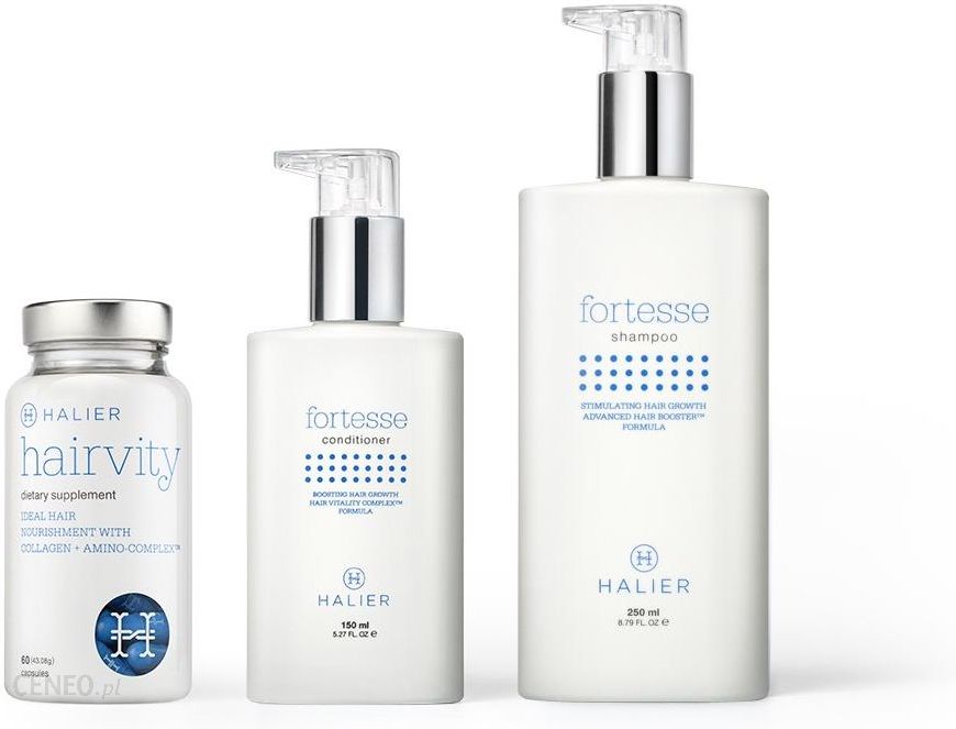 Szampon do włosów Fortesse to kosmetyk stworzony z myślą o kobietach, które mają problem z nadmiernym wypadniem włosów. Kosmetyk przyspiesza wzrost kosmyków, zapobiega ich wypadaniu i wzmacnia je od cebulek aż po same końce. Unikalny skład szamponu Fortesse zawiera zestaw witamin i minerałów niezbędnych dla zdrowia Twoich włosów. Odżywka do włosów Fortesse z formułą Hair Vitality Complex™ zapobiega wypadaniu włosówe, nawilża je i przywraca im naturalny blask. Sprawia, że włosy nie elektryzują się, są dobrze odżywione i podatne na układanie. Odżywka Fortesse pielęgnuje skórę głowy, nie obciążając przy tym włosów. Można ją nanosić bezpośrednio na skalp. Produkt przebadany dermatologicznie. Nutrikosmetyk Hairvity z formułą Kolagen + Amino-Complex™ uelastycznia i wzmacnia strukturę włosów. Zawarte w nim składniki działają przeciwłupieżowo, nadają włosom połysk i zapobiegają ich wypadaniu. Biotyna zwiększa objętość, wzmacnia zniszczone pasma i sprawia, że są one grubsze i mocniejsze, a siarka odpowiada za prawidłowy przebieg fazy wzrostu włosów i wydłuża ją.Opakowanie Hairvity (60 kapsułek) wystarcza na 30 dni stosowania.