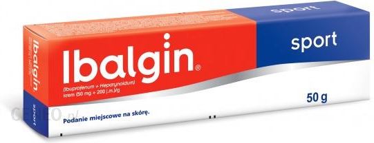 Nazwa: Ibalgin SportPostać: kremDawka: (0,05g+200j.m.)/gOpakowanie: 50 gSkład:1 g kremu zawiera 50 mg (5%) ibuprofenu (Ibuprofenum) oraz 200 j.m. heparynoidu (Heparynoidum).Pełny wykaz substancji pomocniczych, patrz punkt 6.1.Wskazania:Produkt jest wskazany do stosowania w leczeniu miejscowym objawów zapalnych ostrych i przewlekłych chorób reumatoidalnych, bólu związanego z chorobą zwyrodnieniową stawów i kręgosłupa. Ibalgin Sport można również stosować jako środek pomocniczy w leczeniu schorzeń takich jak: zakrzepowe zapalenie żył powierzchownych, zapalenie żył wędrujące, zapalenie żylaków, zmiany miejscowe wywołane leczeniem obliteracyjnym żylaków, zapalenie ścięgien oraz zapalenie mięśni i powięzi, leczenie zmian pourazowych powstałych np. przy uprawianiu sportu, takich jak obrzęki, stłuczenia, krwiaki pourazowe, urazy stawów, uszkodzenia tkanek okołostawowych.Przeciwwskazania:Nadwrażliwość na ibuprofen, heparynoid lub na którąkolwiek substancję pomocniczą wymienioną w punkcie6.1.Nie należy stosować u pacjentów, u których po podaniu kwasu acetylosalicylowego lub innych niesteroidowych leków przeciwzapalnych występowały napady astmy, pokrzywka lub alergiczny nieżyt nosa.Nie należy stosować na otwarte rany, zmiany skórne, błony śluzowe i do oczu.Działania niepożądane:Poniżej podano działania niepożądane zgodnie z klasyfikacją MedDRA i następującymi określeniami częstości występowania: nieznana (nie można ocenić na podstawie dostępnych danych).Zaburzenia ogólne i stany w miejscu podania Częstość nieznana: miejscowe podrażnienie w postaci pieczenia, świądu, zaczerwienienia lub wysypki*.Zaburzenia układu immunologicznego Częstość nieznana: możliwe wystąpienie reakcji alergicznej*.* działania niepożądane mogące wystąpić u wrażliwych pacjentówInterakcje:Kwas acetylosalicylowy podawany ogólnie nasila działanie heparyny.Stosowanie heparyny na duże powierzchnie skóry lub jednoczesne leczenie przeciwzakrzepowe, np.podawanie leków przeciwzakrzepowych lub kwasu acetylosalicylowego, może zwiększyć prawdopodobieństwo wystąpienia krwawienia.Produktu nie należy stosować z lekami stosowanymi miejscowo zawierającymi tetracyklinę i hydrokortyzon, ze względu na niezgodność z heparynoidem.Dawkowanie:Dorośli i dzieci w wieku powyżej 12 lat: 2-3 razy na dobę, nie częściej niż co 4 do 5 godzin, rozprowadzić warstwę kremu o grubości 1 mm na chorej powierzchni i otaczającej okolicy a następnie delikatnie wetrzeć. W przypadku schorzeń żył na chore miejsce można zastosować na noc opatrunek uciskowy. W przypadku leczenia rozległych i bolesnych krwiaków na początku leczenia zaleca się, o ile jest to możliwe, zastosowanie opatrunku okluzyjnego, najlepiej na noc.W celu złagodzenia silnego bólu zaleca się uzupełnienie leczenia podaniem ibuprofenu w tabletkach.Środki ostrożności:Nie należy stosować w przypadku skazy krwotocznej, różnych postaci plamicy, małopłytkowości, hemofilii i różnego rodzaju stanów związanych ze skłonnością do krwawień.Nie należy stosować kremu na duże powierzchnie ciała w przypadku zwiększenia wyników OB, gdyż stosowanie produktu może maskować istotne zmiany tego wskaźnika.Produkt zawiera parahydroksybenzoesan metylu i parahydroksybenzoesan propylu, dlatego może powodować reakcje alergiczne (możliwe reakcje typu późnego). Produkt zawiera glikol propylenowy, dlatego może powodować podrażnienie skóry.Długotrwałe stosowanie może wywołać u niektórych pacjentów skórne reakcje nadwrażliwości. Jeśli wystąpią zmiany skórne (zaczerwienienie, wysypka, świąd, pieczenie, rumień), produkt należy odstawić.Stężenie ibuprofenu stosowanego miejscowo osiągane w krążeniu układowym jest znacznie mniejsze niż po podaniu doustnym, jednak pacjenci z chorobami nerek, zaburzeniami żołądka i jelit powinni poradzić się lekarza przed zastosowaniem produktu.Po każdorazowym zastosowaniu produktu leczniczego należy umyć ręce.Prowadzenie pojazdów:Brak wpływu.Przedawkowanie:W przypadku stosowania miejscowego nie są znane przypadki przedawkowania.Przypadkowe doustne przyjęcie produktu leczniczego, np. przez dziecko, może spowodować wystąpienie nudności i wymiotów, biegunki, bólu brzucha. W takich przypadkach zalecane jest sprowokowanie wymiotów, utrzymanie drożności dróg oddechowych i monitorowanie czynności serca aż do osiągnięcia stabilnego stanu pacjenta.Ciąża:W okresie ciąży lub laktacji produkt może być stosowany tylko przez krótki czas, wyłącznie w uzasadnionych przypadkach. W ostatnim trymestrze ciąży nie zaleca się stosowania produktu ze względu na możliwy wpływ na przebieg akcji porodowej (wpływ na krwawienie).