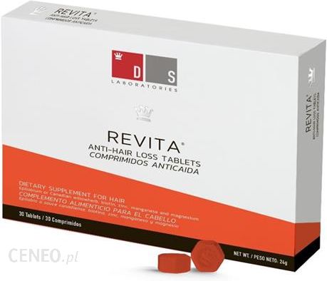 Suplement diety przeciw wypadającym włosom Revita odżywia słabe włosy, zapobiega ich wypadaniu i stymuluje ich odrost. Formuła zawiera melatoninę, silny przeciwutleniacz i modulator wzrostu, który osłabia stres oksydacyjny komórek mieszków włosowych. Przedłuża fazę anagenu (wzrostu) opóźniając fazę telogenową (spoczynku).W składzie znajdują się również: witamina D i izoflawony takie jak Biochanin A i Daidezin z ekstraktu sojowego. Izoflawony zmniejszają stężenie DHT (dwuhydrotestosteronu) w mieszkach włosów i przywracają równowagę hormonalną. Zmiany hormonalne są istotną przyczyną utraty włosów u kobiet w okresie menopauzy i po menopauzie. Daidezin działa jako silny przeciwutleniacz.Ekstrakt z wierzbownicy hamuje działanie enzymu 5α-reduktazy i ma działanie przeciwzapalne. Enzym 5α-reduktazy przekształca testosteron w DHT. Dwuhydrotestosteron powoduje miniaturyzacje mieszków włosowych i w konsekwencji wypadanie włosów.Lucerna wzmacnia cebulki włosów co w rezultacie prowadzi do zatrzymania wypadania włosów i ich szybszego wzrostu.Ekstrakt z jabłek Malus pumila Mill. jest silnym przeciwutleniaczem i działa ochronnie na skórę głowy. Dodatkowo zmniejsza przetłuszczanie się skóry głowy i dodaje włosom blasku.Składniki 1 tabletkadziennie zapotrzebowanieDaidzein 75 mgBeta-sitosterol 75 mgLucerna ekstrakt(Medicago Sativa) 50 mgMagnez (as Magnesium Oxide) 20,5 mg 5%Wierzbownica (Fireweed) ekstrakt(Epilobium Angustifolium L.) 20 mgEkstrakt z jabłek (Malus Pumila Mill.) 20 mgBiochanin A 10 mgŻelazo (as Ferrous Gluconate) 4 mg 29%Cynk (as Zinc Gluconate) 3,75 mg 38%Melatonina 1 mgBiotyna 300 mcg 100%Witamina D (as Cholecalciferol) 400 Ul 100%Opakowanie zawiera 30 tabletek.Stosować 1 tabletkę dziennie popijając dużą ilością wody. Najlepiej w trakcie lub po posiłkuSkład:Daidzein, Beta-sitosterol, Alfalfa extract (Medicago Sativa), Ferrous gluconate, Magnesium oxide, Zinc gluconate, Epilobium extract (epilobium angustifolium l.), Apple extract (malus pumila mill), Soja dry extract (glycine soja), Biochanin A, Cholecalciferol (vitamin D3), Melatonin, Biotin (vitamin H), Acidifier (E341), Bulking agent (E460), Anti-caking agents (E470B, E551, E570), Thickeners (E464, E466), Lactose, Colorants (E171, E110).